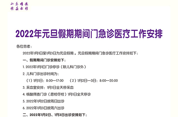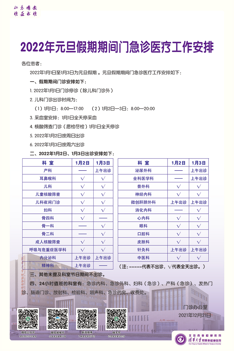 【重要通知】北京市垂杨柳医院2022年元旦假期期间门急诊医疗工作安排