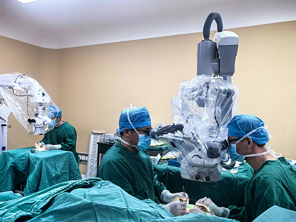 在经过与患者及家属的充分沟通后,一场惊心动魄的战斗正式打响了。手术在崔勇的指挥下有序进行。手术人员分两组同时进行,手足外科(骨三科)副主任医师韩正锋与商俊刚负责右手的清创及神经、血管近侧断端的寻找;副主任医师尹建负责离断手指的清创及神经、血管远侧断端的寻找。一边是患者及家属的充分信任,一边是手术难度的挑战。无影灯下,医生们全身贯注,为了尽量减少对残余组织的损伤,手术在显微镜下清创。一场比拼技能与体能的高难度外科手术就此拉开序幕。