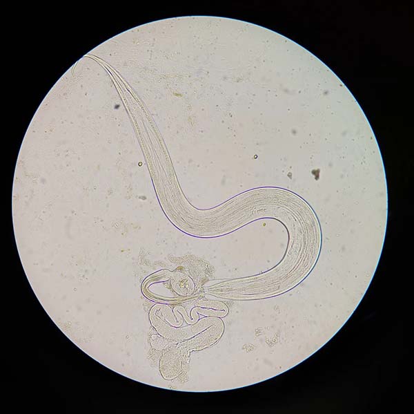 实验室工作人员在显微镜下可观察到具有体型细长如线,尾部尖直、头端两侧角皮膨大呈翼状透明结构的成虫,及大量无色透明,两侧不对称椭圆形虫卵。(如图1,2)