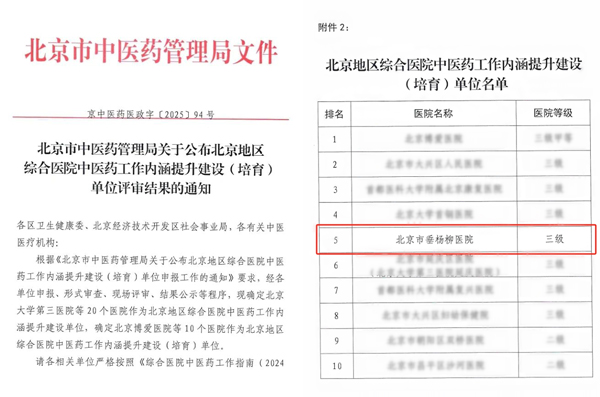 【垂医荣誉】喜报:北京市垂杨柳医院获评北京地区综合医院中医药工作内涵提升建设(培育)单位