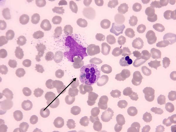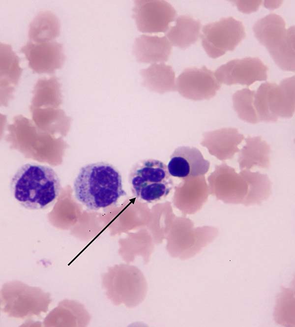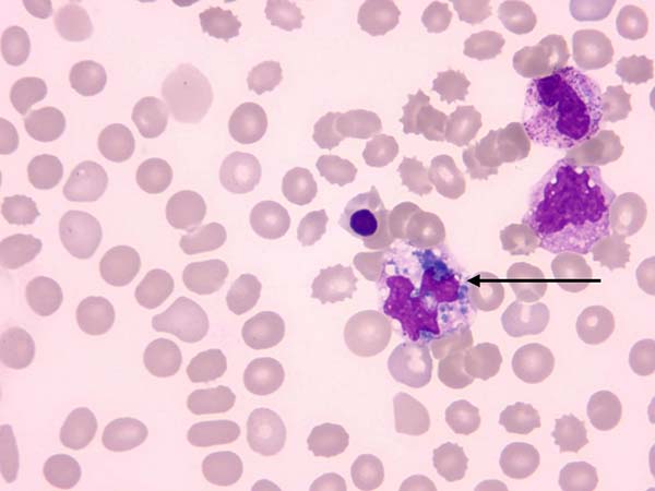 蓝绿色包涵体的具体来源尚不明确,但多数研究推测其与肝病有关,并认为是中性粒细胞和单核细胞吞噬了肝细胞损伤的产物,为胆汁相关物质或溶酶体降解产物。Harris等人提示绿色包涵体可能是一种胆汁相关产物胆绿素,但确实无特殊的胆绿素染色方法来证实。Hodgson等对2例患者外周血中性粒细胞进行了透射电镜观察,中性粒细胞胞浆中包涵体与光学显微镜下特征一致。包涵体具有嗜锇特性,揭示其富含脂质成分,推测由胞膜或囊泡组成,并通过染色将此类色素归为脂褐素,为中性粒细胞或单核细胞吞噬了缺血性肝炎损伤时释放的脂褐素样物质或其他溶酶体降解产物。