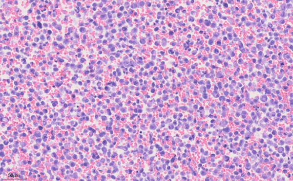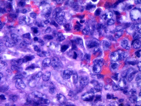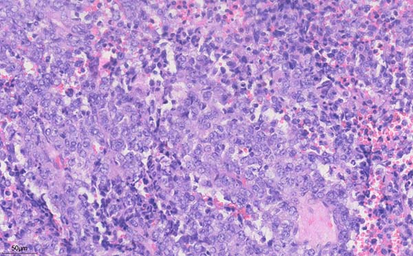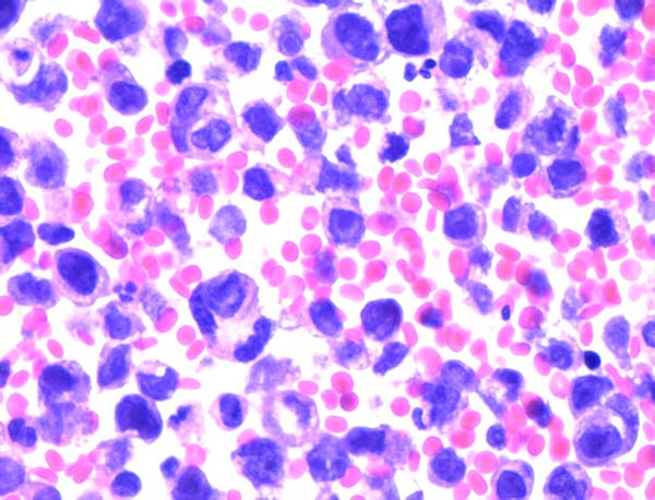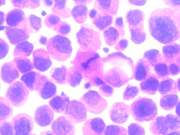 细胞沉渣石蜡包埋HE切片:血性背景中可见大量恶性肿瘤细胞,粘附性差,核形不规则,可见泡状核,部分胞浆丰富,核分裂象易见。