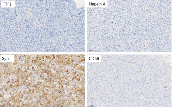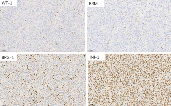 细胞沉渣免疫组化显示肿瘤细胞:TTF-1(-),Napsin-A(-),EMA(+),Calretinin(间皮+),Desmin(间皮+),CK7(间皮+),CK5(间皮+),CK(间皮+),Vimentin(+),LCA(淋巴细胞+),CgA(个别+),INI1(+),BRG1(部分-,部分弱+),BRM(-),WT-1(间皮+),Syn(+),CD56(-)。