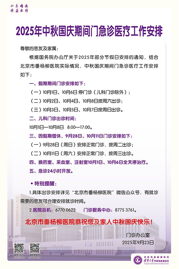【出诊通知】北京市垂杨柳医院2025年中秋国庆期间门急诊医疗工作安排