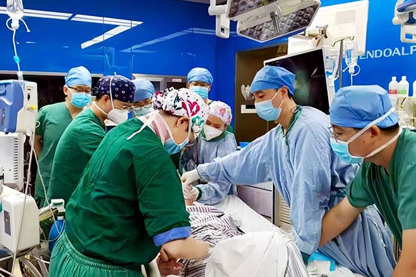 确定手术方案后,微创中心(第二手术区)护士长刘骥立刻带领微创手术室护理团队准备了气管镜、激光、冷冻及电外科等相关呼吸介入治疗设备。由于患者严重呼吸困难,患者入室时心率已升高至190次/分,麻醉科主任杨彦伟带领主任医师金运敏、医师任骏飞密切监测患者生命体征,精准调整麻醉药物,确保手术进行。