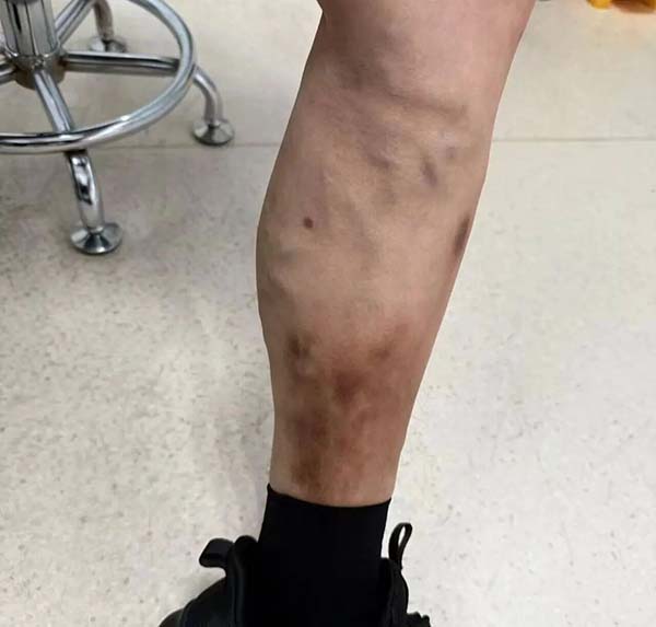 李先生的父亲就是因为痛觉不敏感,觉得“不疼不痒”,所以没当回事。但检查发现,他的下肢静脉瓣膜已经严重受损,而且皮肤发黑是“老烂腿”的前期信号,如果再拖下去,很容易出现溃疡。