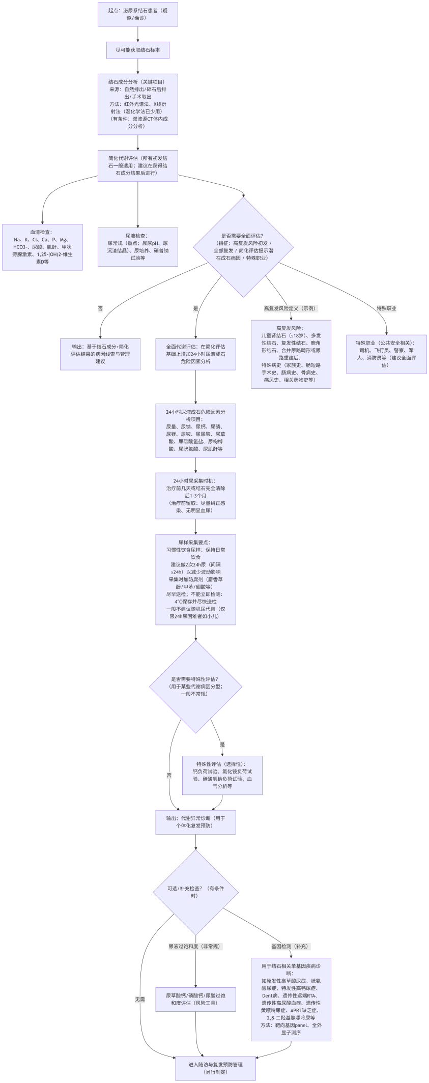 全面评估用于诊断结石患者的各种代谢异常,适用于高复发风险的初发性结石患者、全部复发性结石患者以及经简化评估后疑有潜在成石病因者。