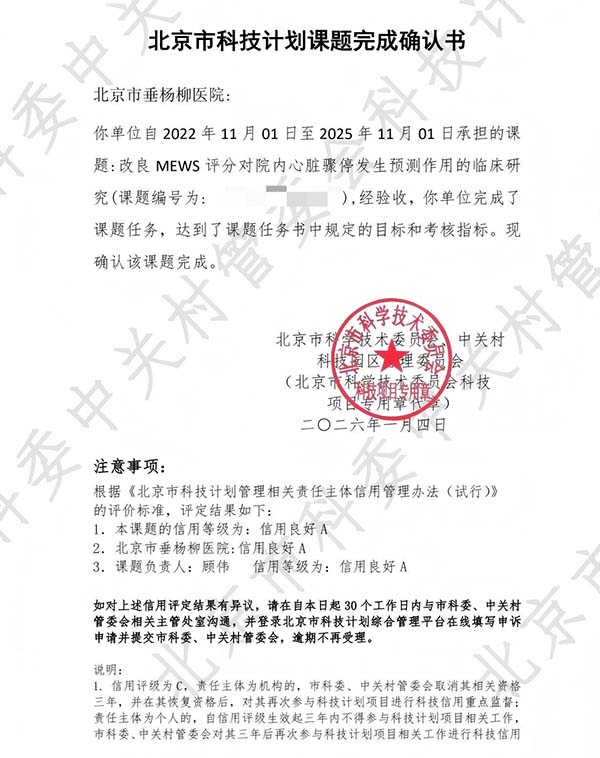 近日,经北京市科学技术委员组织专家组对2025年的“北京市技计划课题”进行评审,经过初审、书面评审、现场答辩和终审。清华大学附属垂杨柳医院急诊医学科主任顾伟主持的“改良MEWS评分对院内心脏骤停发生预测作用的临床研究”课题项目,因课题的出色完成,被评为A级的好成绩。