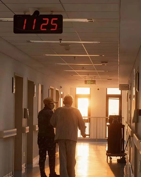 杨先生术后仍需逐步恢复活动能力,进行术后康复训练。主治医生建议在家人陪伴下开展科学的、循序渐进的行走训练。当天下午,王女士小心搀扶着老伴在走廊内慢步走动,并不时提醒其控制步速、保持呼吸平稳,严格遵循康复要求。