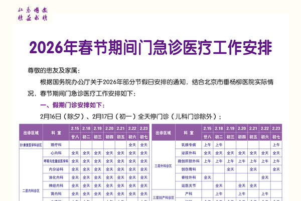 【出诊通知】北京市垂杨柳医院2026年春节期间门急诊医疗工作安排