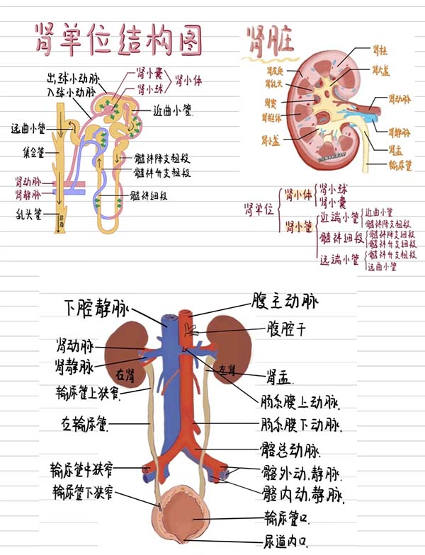 肾小管:包括近曲小管、髓袢降支与升支、远曲小管,末端连接集合管。集合管汇集多个肾单位的尿液,经肾盏、肾盂、输尿管进入膀胱。每个肾脏约有250条较大的集合管,每条约收集4000个肾单位的尿液,在尿液浓缩过程中发挥关键作用。