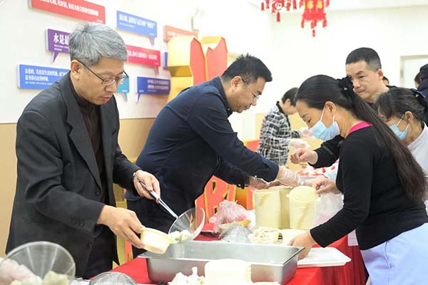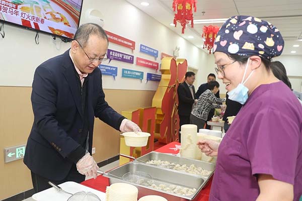 晚17时许,医院党委书记吴兴海,党委副书记、院长张新庆,党委副书记、副院长赵伟,纪委书记邢超,副院长程少为、黄春雷,携党委办公室、安保部、政宣科等职能部门负责人,来到医院食堂,为节日期间仍坚守在临床一线的医护人员及职工送上热气腾腾的饺子和最真挚的新春祝福。