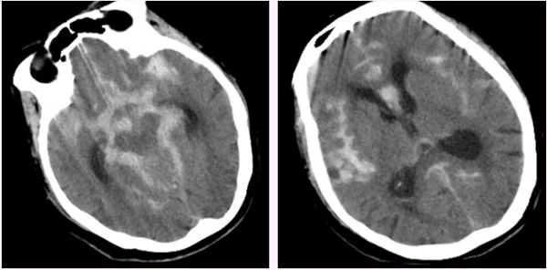 ▲头颅CT显示广泛蛛网膜下腔出血,脑室积血