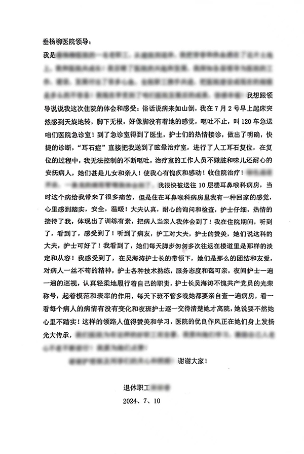 服务有温度,医患显真情。近日,医院收到了一封感谢信,退休职工宋女士因突发眩晕,呕吐不止,由120送来医院急诊就诊。经急诊诊断为“耳石症”,并收入医院耳鼻喉科(10C)治疗。在耳石复位过程中,宋女士因眩晕再次呕吐不止,医护人员耐心安慰,并及时处理了污物。不怕脏不怕累的工作作风和温柔热情的诊疗态度让宋女士感受到家庭般的温暖,也对医院的诊疗和服务给予了极大的肯定与感谢,出院之际,她为医护人员送上一封饱含深情的感谢信。