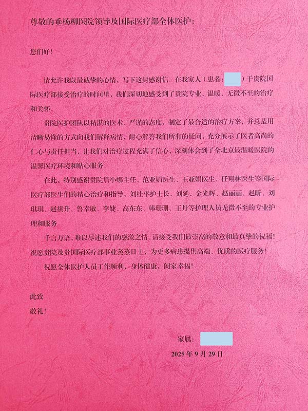 【患者之声】跨越重洋的信任:清华大学附属垂杨柳医院国际医疗部获患者家属感谢信