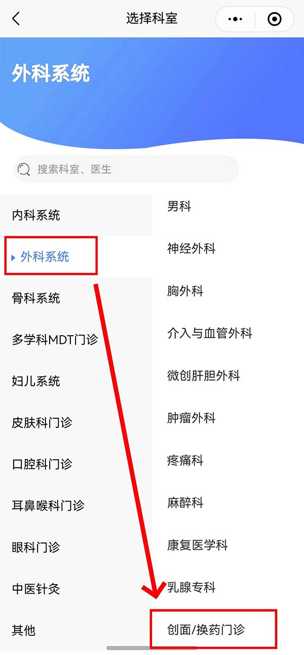 ●小程序预约挂号选择流程:预约挂号--外科系统--创面/换药门诊。