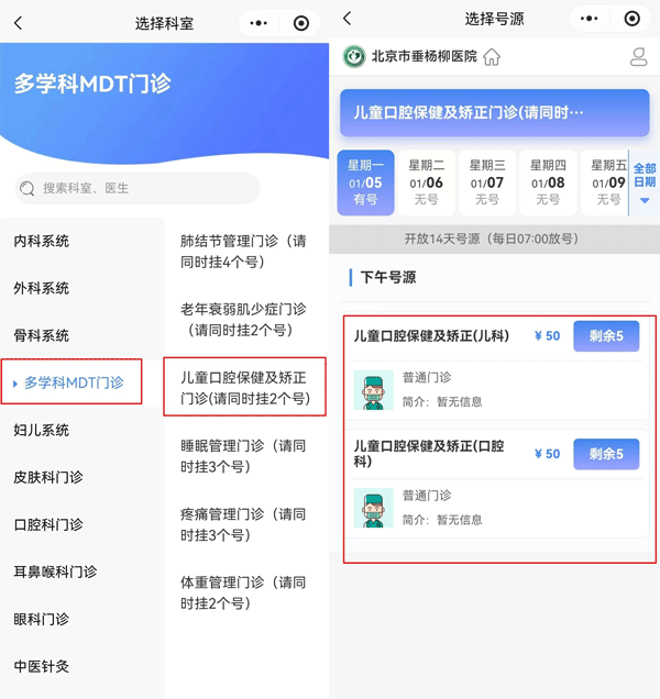 儿童口腔保健及矫正门诊预约挂号指南:微信关注“北京市垂杨柳医院”公众号--预约挂号--多学科MDT门诊--儿童口腔保健及矫正门诊(请同时挂2个号)