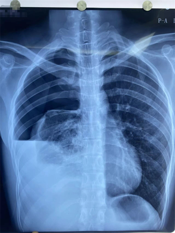 21岁的小王正值大四,一天前日常活动后突然觉得右侧胸闷、呼吸困难,伴右侧胸痛,休息后自觉缓解。第二天患者自觉胸痛及胸闷症状明显加重,校医院胸部X线片提示右侧液气胸,右肺压缩大于80%(如图1),属于典型自发性血气胸。患者经由120紧急送至清华大学附属垂杨柳医院急诊。此时,患者大汗,贫血貌,胸痛无法平卧,胸外科主治医师赵云会诊并请示胸外科主任崔健,明确诊断为右侧血气胸。需尽快手术治疗。