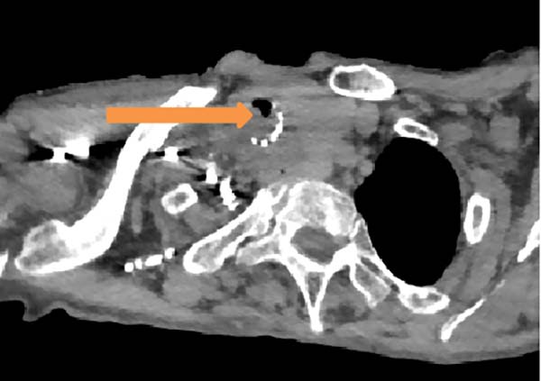 图1术后CT(箭头处为原气道最狭窄处)