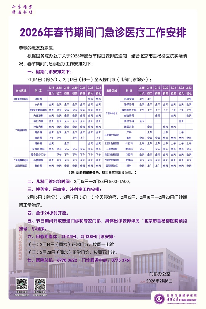 【出诊通知】北京市垂杨柳医院2026年春节期间门急诊医疗工作安排