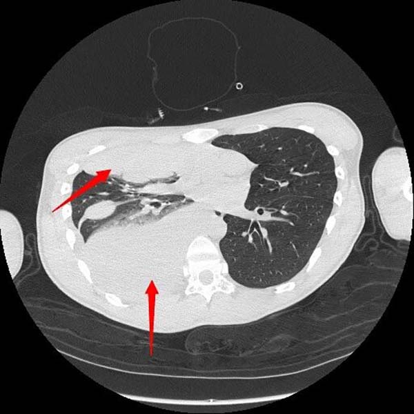 患者半月前因右侧气胸接受胸腔镜下肺大疱切除手术。术后一周出现右侧血胸,再次接受胸腔镜止血治疗。本以为病情逐步稳定,却在出院两日后突发右侧胸痛,疼痛持续不缓解,伴大汗、短暂意识丧失,由120紧急送至清华大学附属垂杨柳医院急诊救治。