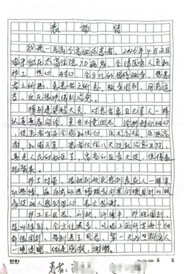 主治医生梁超,待患如亲、尽职尽责,每日坚持亲自查房、监测血压,细致问诊、精准施治,不仅用精湛医术快速控制患者病情,更时刻关注患者情绪,用暖心沟通给予患者满满的安全感。短短8天,患者便顺利出院,特意在信中由衷称赞:“真是人民的好医生,高尚的医务天使,值得表扬赞美!”